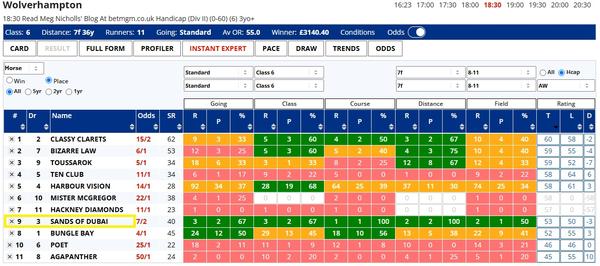 ...here's an example for one of the races at Wolverhampton tonight (the 6:30 race), using the extremely popular 'Instant Expert' view on the GeeGeez racecards...